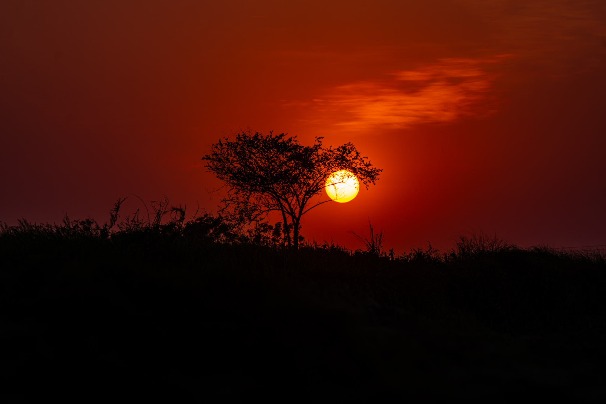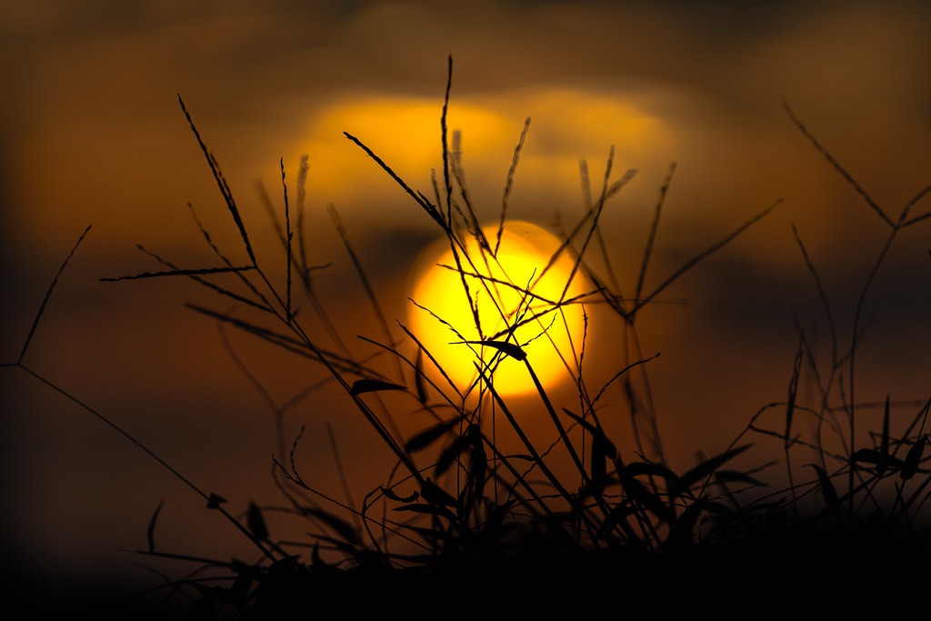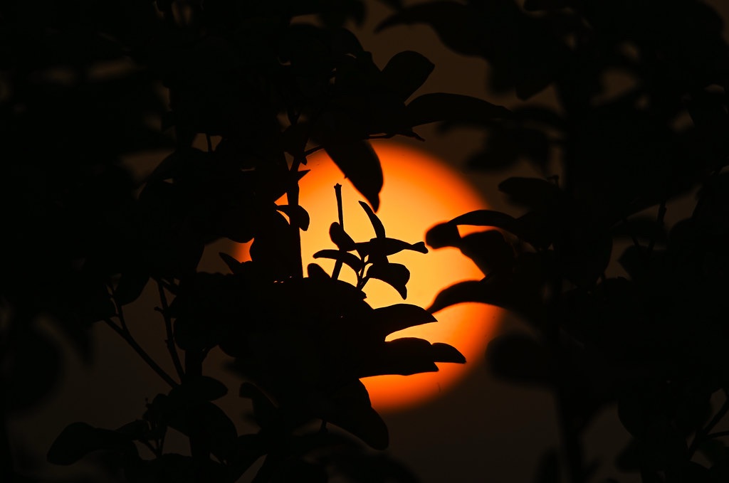 Behind the quiet shadows of leaves, the sun glows like fire. Morning light slowly breaks the sleep of night. Silent trees stand still, as if time itself has paused— And a new day is born from the heart of darkness.