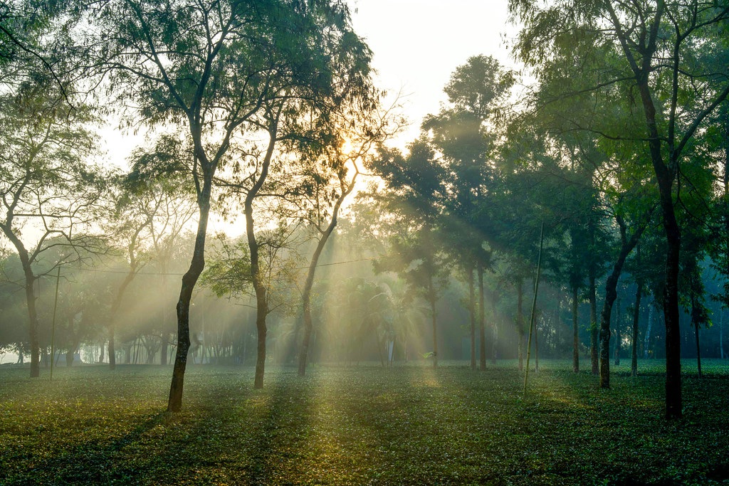 Behind the quiet shadows of leaves, the sun glows like fire. Morning light slowly breaks the sleep of night. Silent trees stand still, as if time itself has paused— And a new day is born from the heart of darkness.flic.kr/p/2rZFge4 Lalmatia, Dhaka, Bangladesh on November 06, 2022 with Nikon Z7