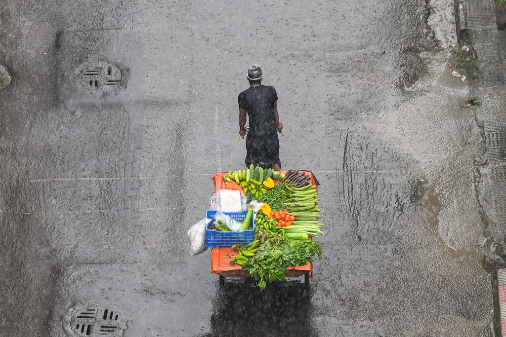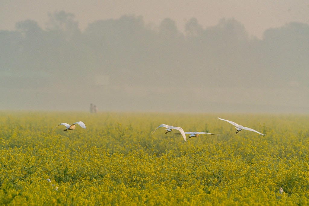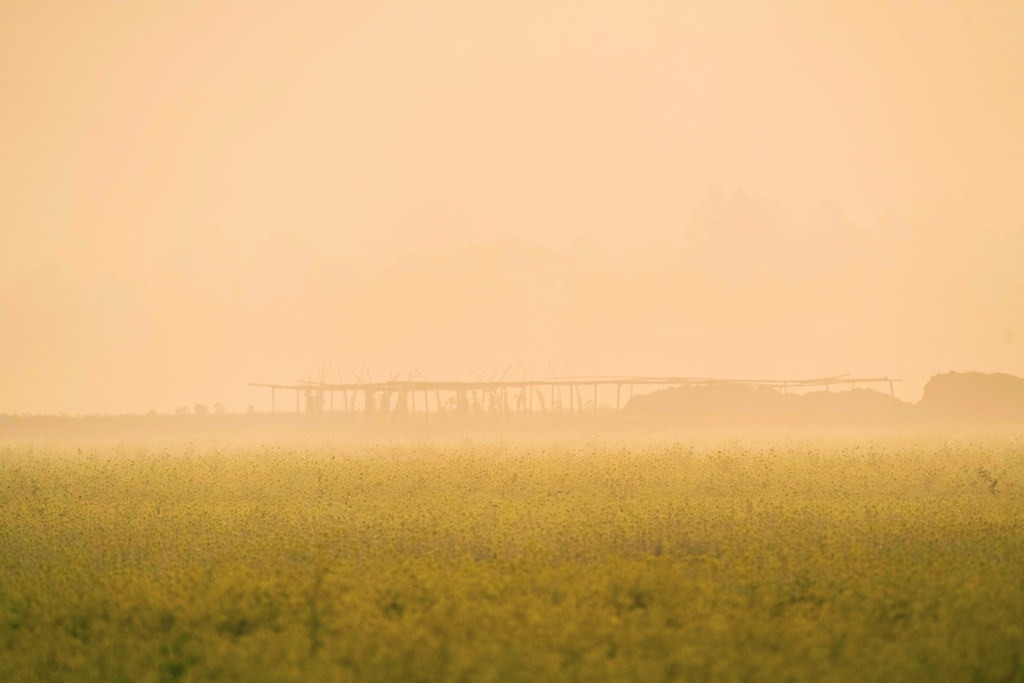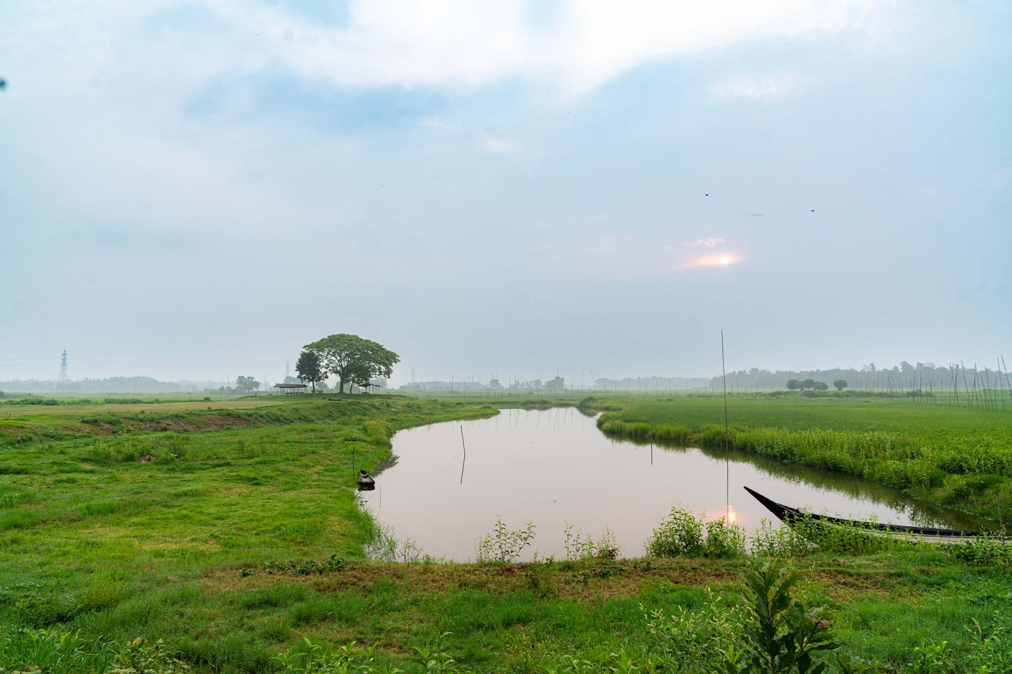 Pigeons rise where highrise buildings kiss the morning sky,Sunlight spills on tin roofs as rickshaws pass by.Colors bloom in smog-kissed light, soft and slow—Dhaka wakes beneath wings in a saffron glow.