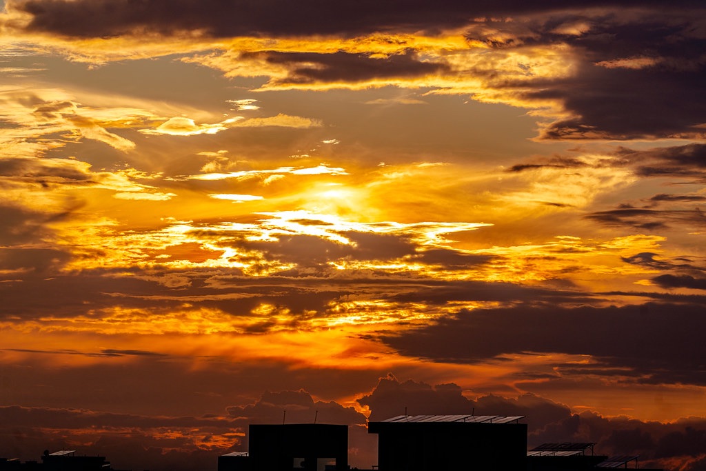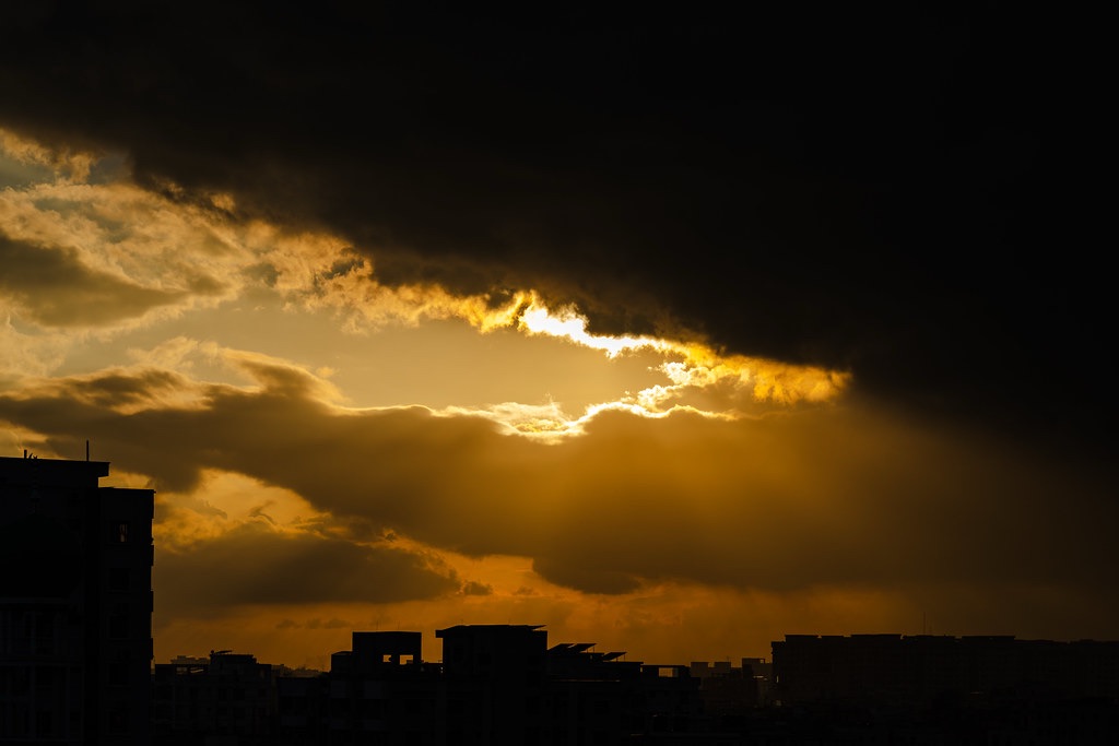 Golden light breaks through the storm, A city breathes beneath the cloud’s form. Day retreats, but not in haste— It leaves behind a sky half-blazed.